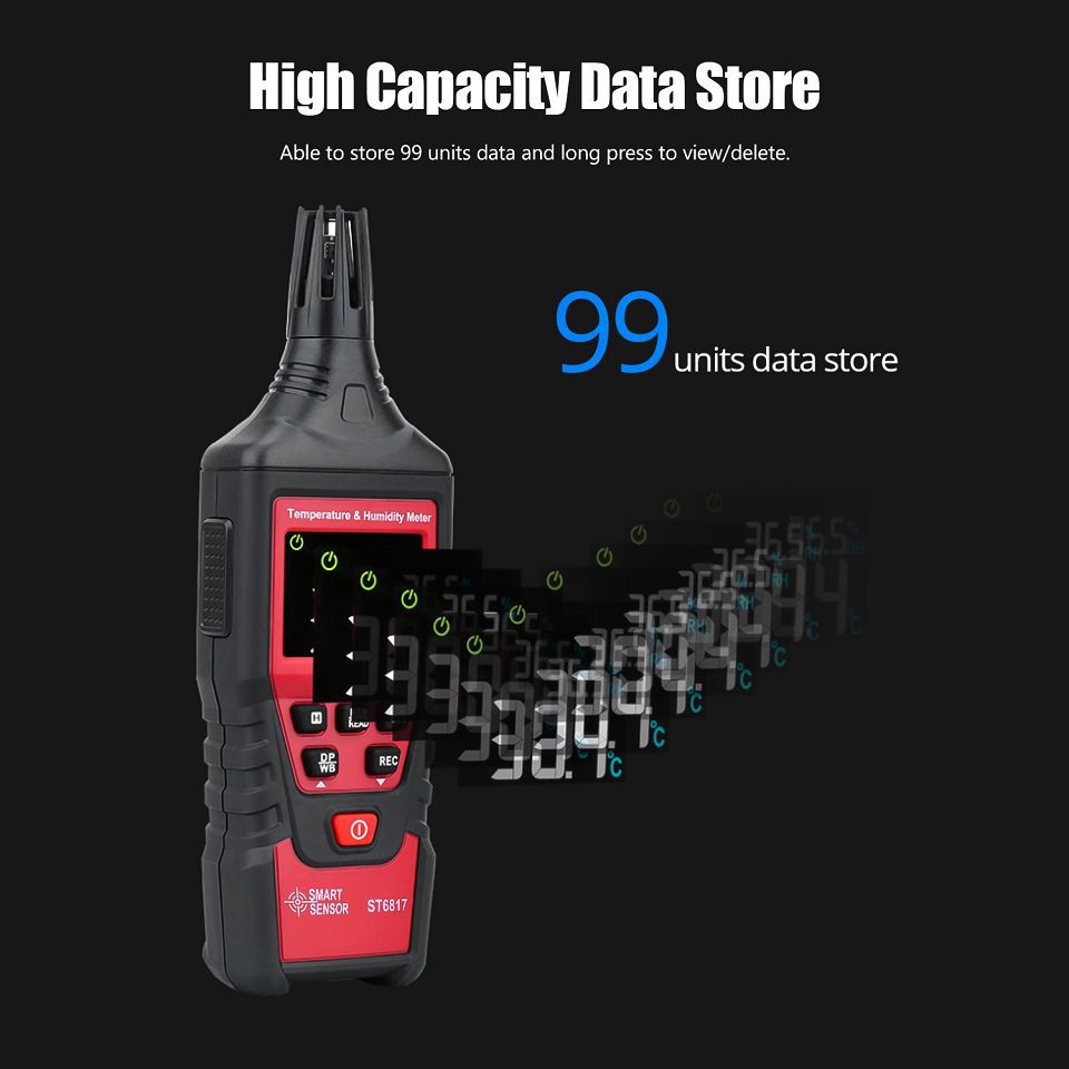 Ta profesionalni meter lahko meri temperaturo in vlažnost z zanesljivimi rezultati merjenja. Dvojni prikaz temperature in vlažnosti, enostaven za izmenjavo med °C in °F. Primeren je za uporabo v laboratoriju, skladišču, restavraciji, rastlinjaku, klimatiziranih sobah itd.